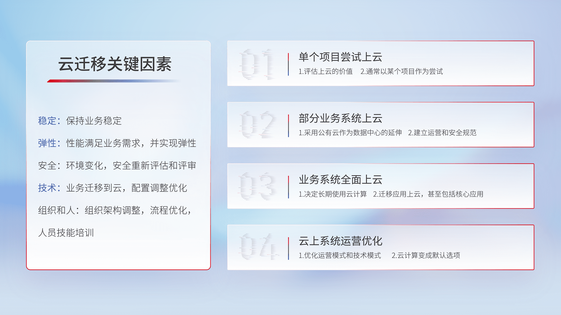 结合实际业务,,从规划设计、、、云平台选型、、云原生改造、、、数据迁移、、、、集成交付,,,迁移全过程为客户识别最佳上云路径,,,,做好风险识别管理,,,设计网络架构、、身份权限、、、、安全审计合规、、、、操作审计、、、日志审计、、监控告警策略、、、、多站点容灾设计等,,,,对云上基础设施进行整体规划,,,,提升IT治理水平,,,以满足弹性、、高可用、、高性能的需求。。。。