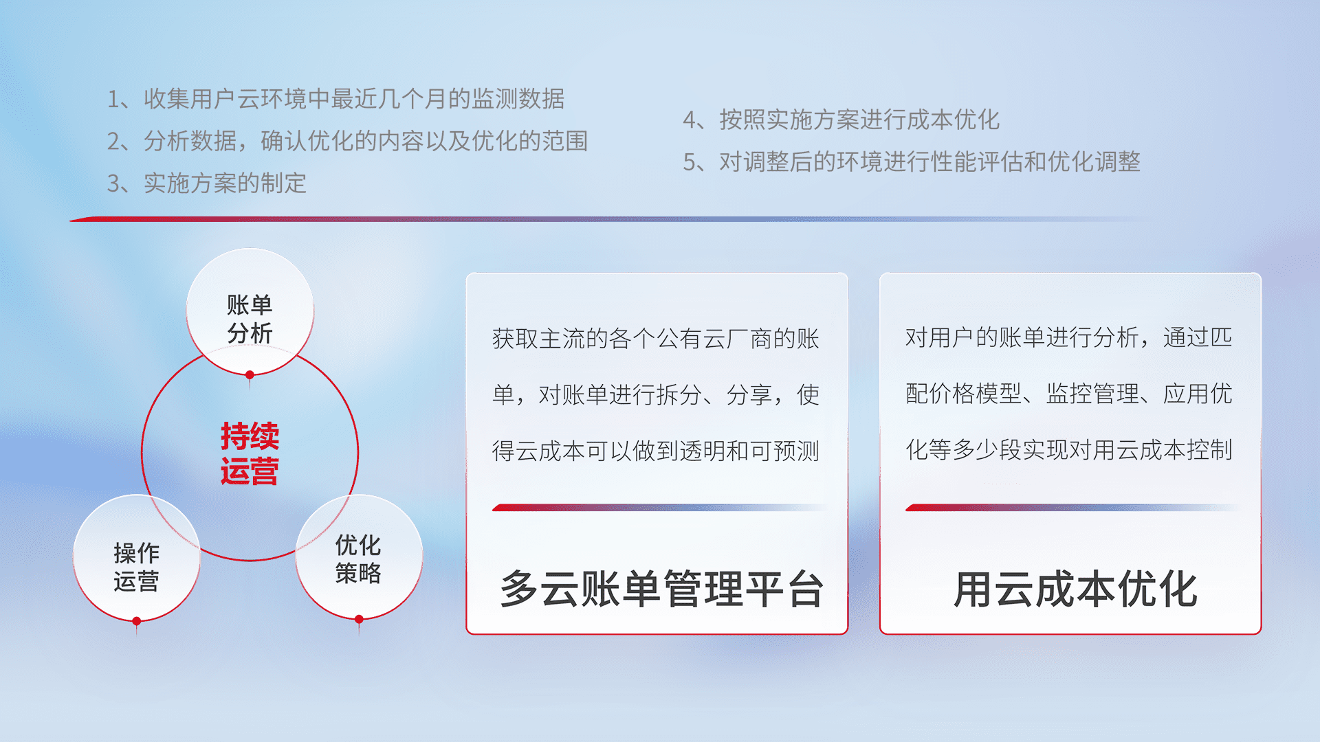 通过多云纳管,,,,以统一的资源数据模型把客户的云资源进行抽象和封装,,,进而实现对多云资源的统一操作,,保障云资源管理的可靠性、、稳定性与可用性。。。。量身定制化运维内容,,,配置、、、、开发运维、、、补丁管理、、、备份、、、、监控、、、、认证和访问管理、、、审计和日常巡检等,,,,保障在用云过程中的可靠度,,,,稳定度以及高可用率。。。
